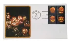 The sheet of 20 Stamps features four different photographs of jack-o??-lanterns. The jack-o??-lanterns were carved by Paul Montanari and photographed by Sally Andersen-Bruce. The Stamps were designed by art director Derry Noyes.