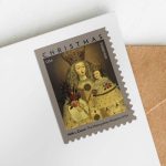 This Christmas stamp features a detail of the painting Our Lady of Gu??pulo. Painted in the 18th century by an unknown artist in Cuzco, Peru, Our Lady of Gu??pulo is from the collection of The Metropolitan Museum of Art in New York. Enrobed in a pyramidal gown speckled with jewels and holding a scepter woven with roses and leaves, a crowned Virgin Mary looks down at a similarly adorned Christ Child in her left arm.